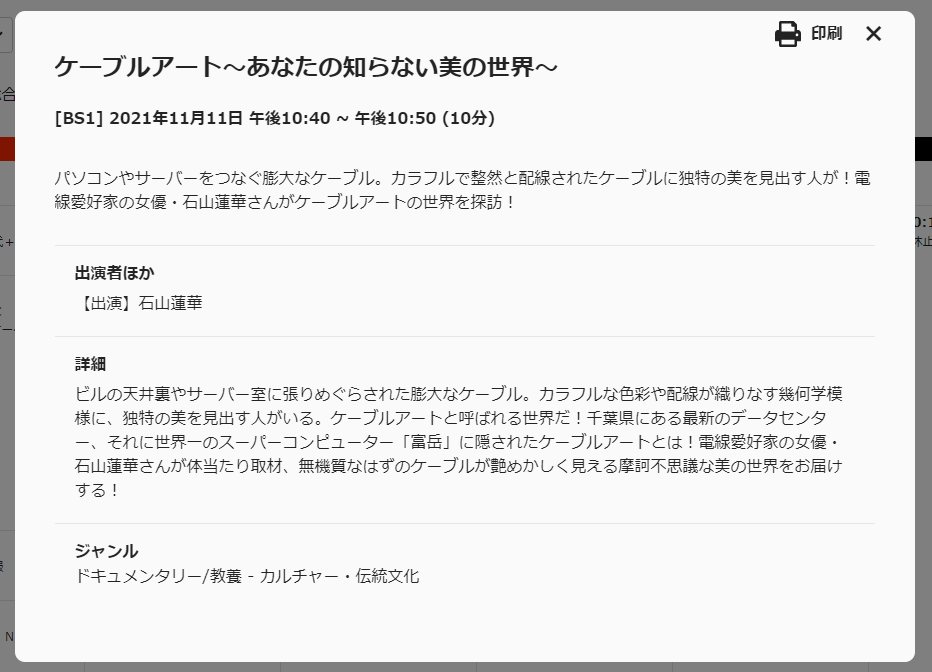 昨年11月に放送されて話題になった、データセンターのケーブルを愛でる番組「ケーブルアート~あなたの知らない美の世界~」が3/18 1:57(3/17 25:57)にNHK BS1にて再放送されます。