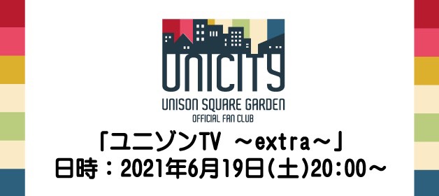 7/23(金祝)アコースティック編成・24(土)バンド編成にて開催する、FC限定オンラインライブ「UNICITY LIVE ONLINE」のチケット(前売り)販売中!また、先日生配信したライブ事前特番「ユニゾンTV~extra~」のダイジェスト映像公開!※FC会員の方はログイン後に申込可能