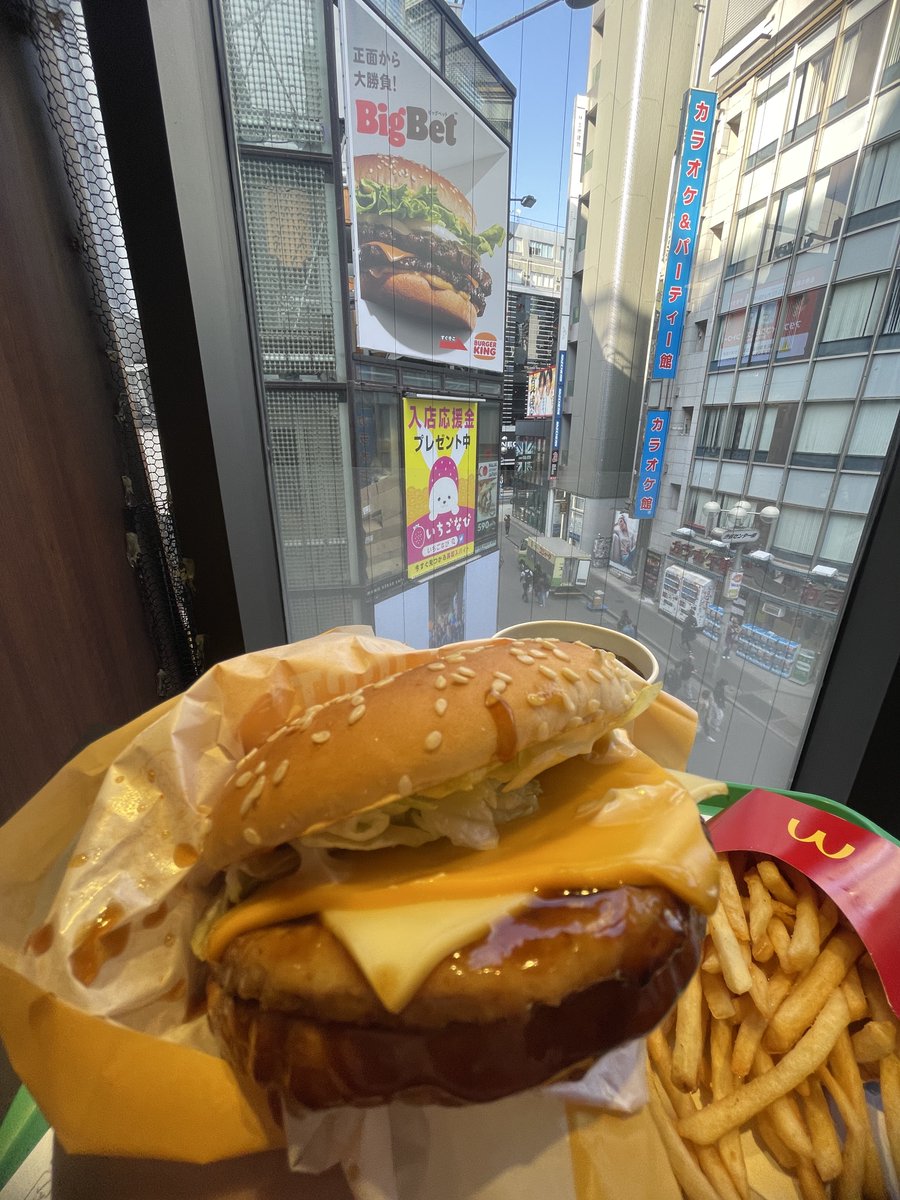 マクドナルドの店内じゃないとまともに見えないバーガーキングの看板広告を実際に確かめに行ってみた。野外から見ると歪んで見えるがマクドナルド店内から見るとハッキリ見える広告 笑
