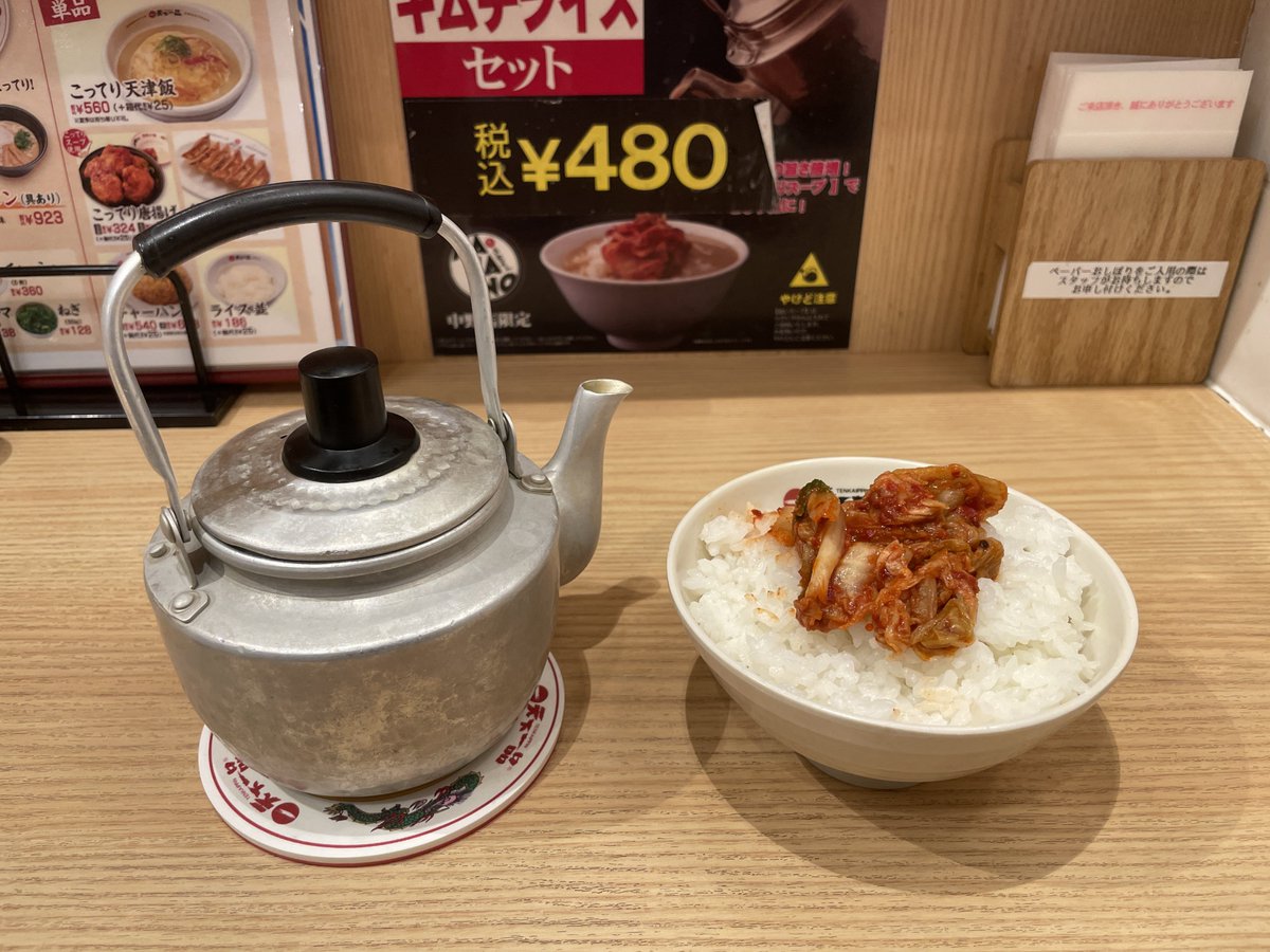 追いスープキムチライスセットは天下一品の中野店限定メニューとのこと。ヤカンがいいよね。日本酒とかマッコリ入れる居酒屋はあるけど、こってりラーメンのスープを入れるとはね。ステキやん? うまい