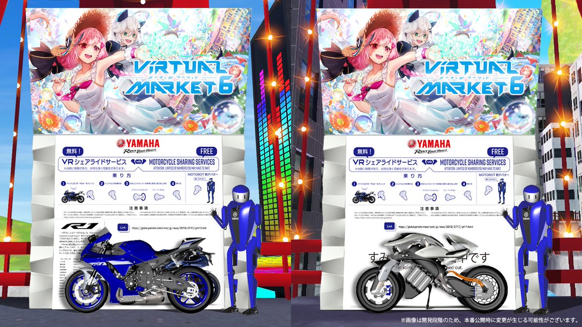 ヤマハ発動機は、8月14日(土)~8月28日(土)の期間、バーチャルリアリティ(VR)上で開催される世界最大規模の展示会「バーチャルマーケット6」に、YZF-R1、MOTOROiDを出品し、VRワールド内を移動できる無料のシェアライドのサービスを提供します。#Vket #VRChat