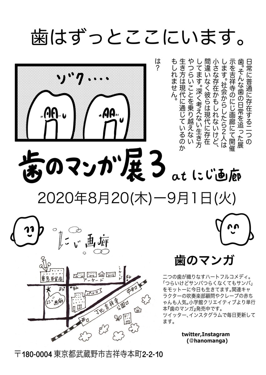 【🔔お知らせ🔔】 『歯のマンガ展3』をやります。吉祥寺にじ画廊にて8月20日から9月1日まで。入場の際は人数を制限させて頂きます。土日は予約制です。予約はこちらまでお待ちしております。👀↓