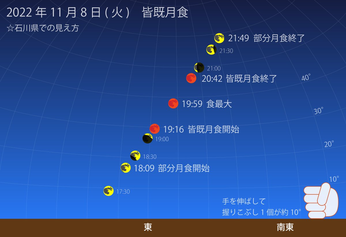 11月8日(火)の皆既月食のスケジュールです。