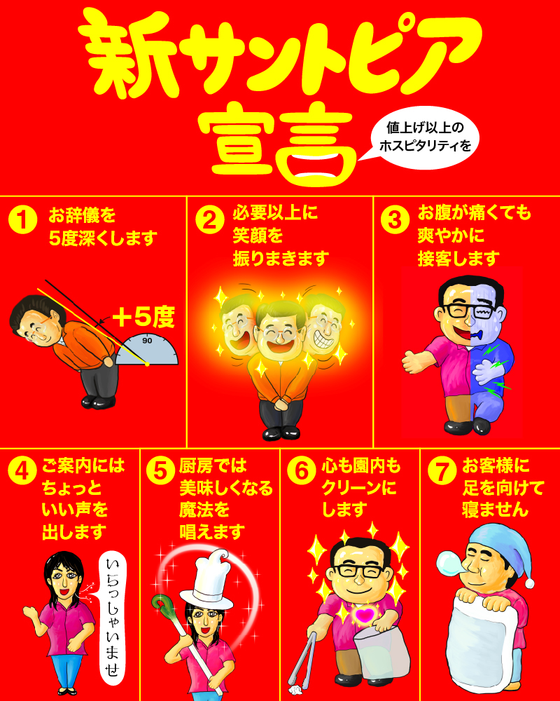 昨日値上げを発表させていただきましたが、それで終わるのはサントピアらしくない!そう思いました。そこで、値上げ以上にホスピタリティを高め、お客さまに喜んでいただくための新たな宣言をします。【新サントピア宣言】。できることから始めます!温かく見守ってください!