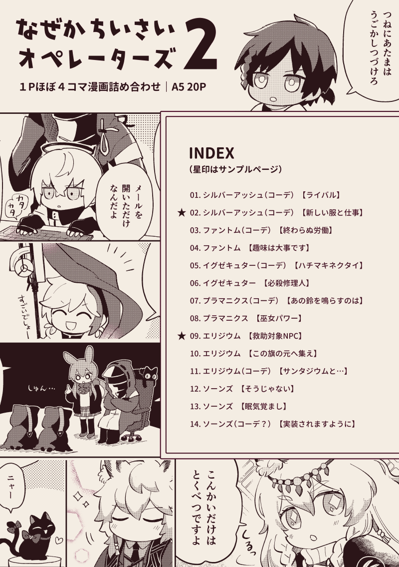 サンプルにあるような1P漫画の詰め合わせ本です。表紙にいるキャラがそれぞれ登場します。A5サイズ20P