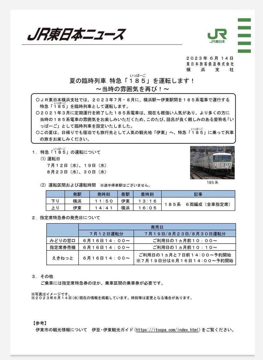 7/12,19,8/23,29に横浜-伊東で185系による特急「185(いっぱ-ご)」運転…?!