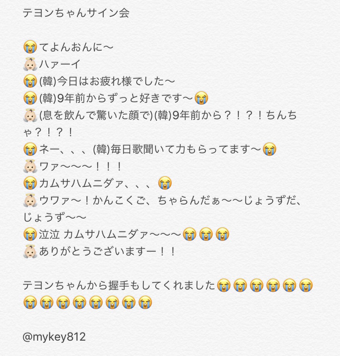 まさかの、当たって、初めてのテヨンちゃんのサイン会😭 言いたいこと言わなきゃ!と思って必死に顔見ながらしゃべってたらいつの間にかサイン書き終わってた(笑)顔小さすぎだし可愛すぎだしほんとに여신だったー😭😭😭💗💗💗 反応が可愛すぎました…………
