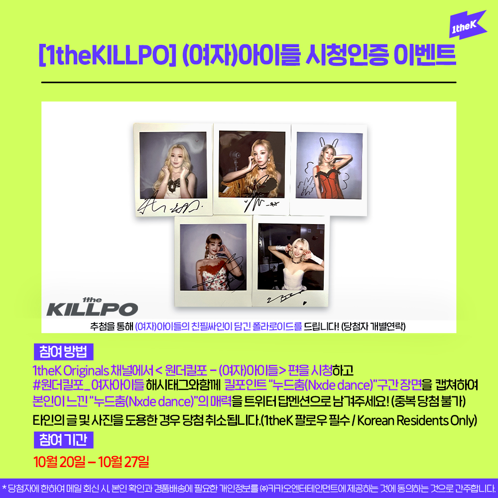 #원더킬포_여자아이들 영상을 보고 킬포인트 “누드춤(Nxde dance)” 구간 장면을 캡쳐하여 본인이 느낀 “누드춤(Nxde dance)”의 매력을 해시태그와 함께 보내주세요! 추첨하여 (여자)아이들의 싸인 폴라로이드를 드립니다. (@1theK 팔로우😉/당첨자 개별연락)