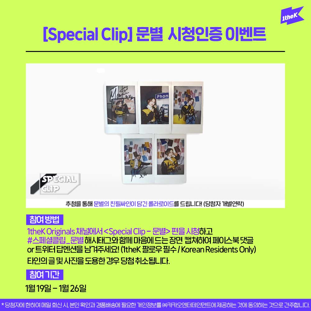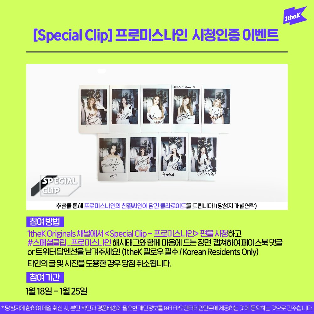 #스페셜클립_프로미스나인 영상을 보고 가장 마음에 드는 장면을 캡쳐하여 해시태그와 함께 보내주세요! 추첨하여 프로미스나인의 싸인 폴라로이드를 드립니다. (@1theK 팔로우😉/당첨자 개별연락)