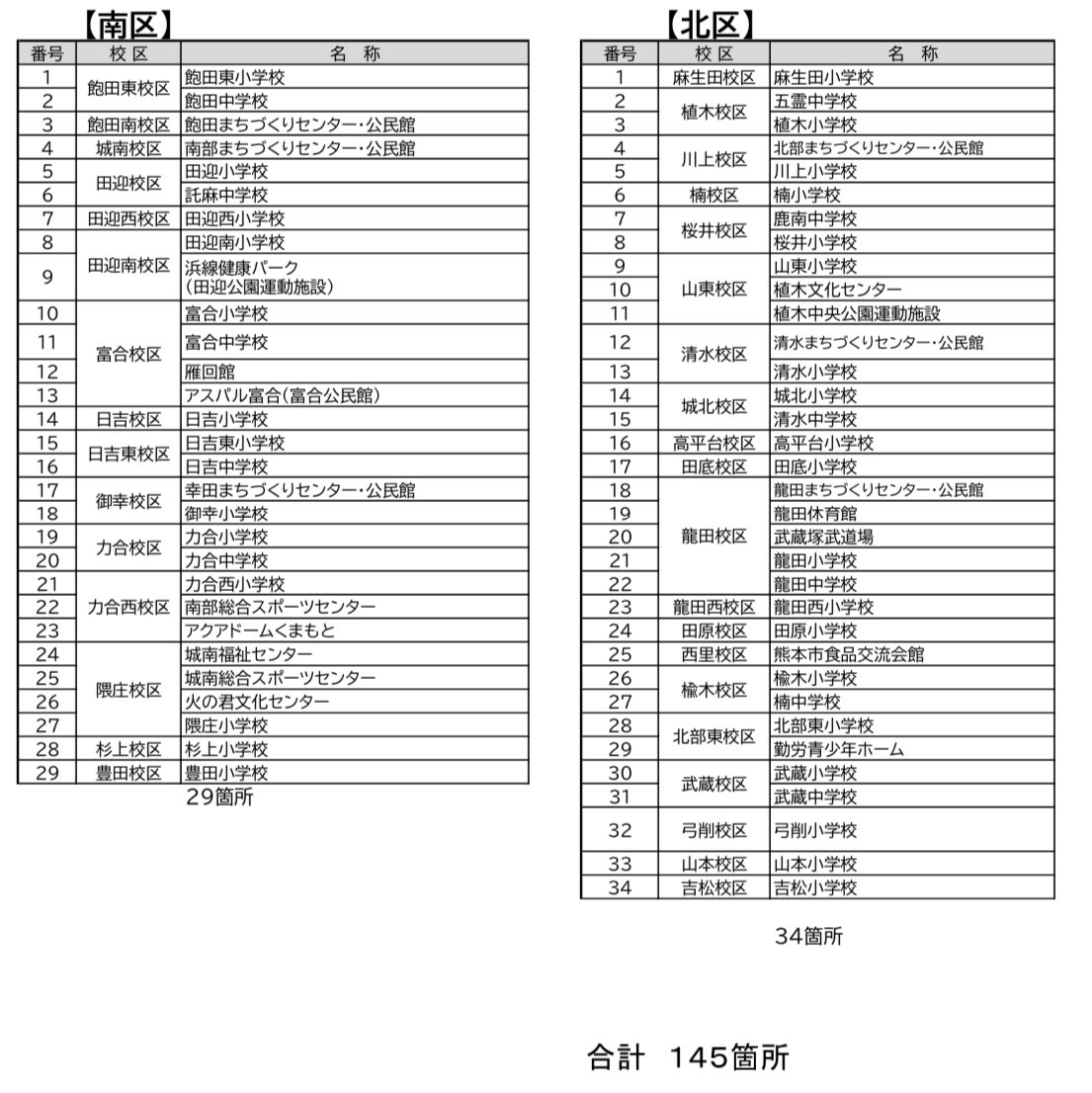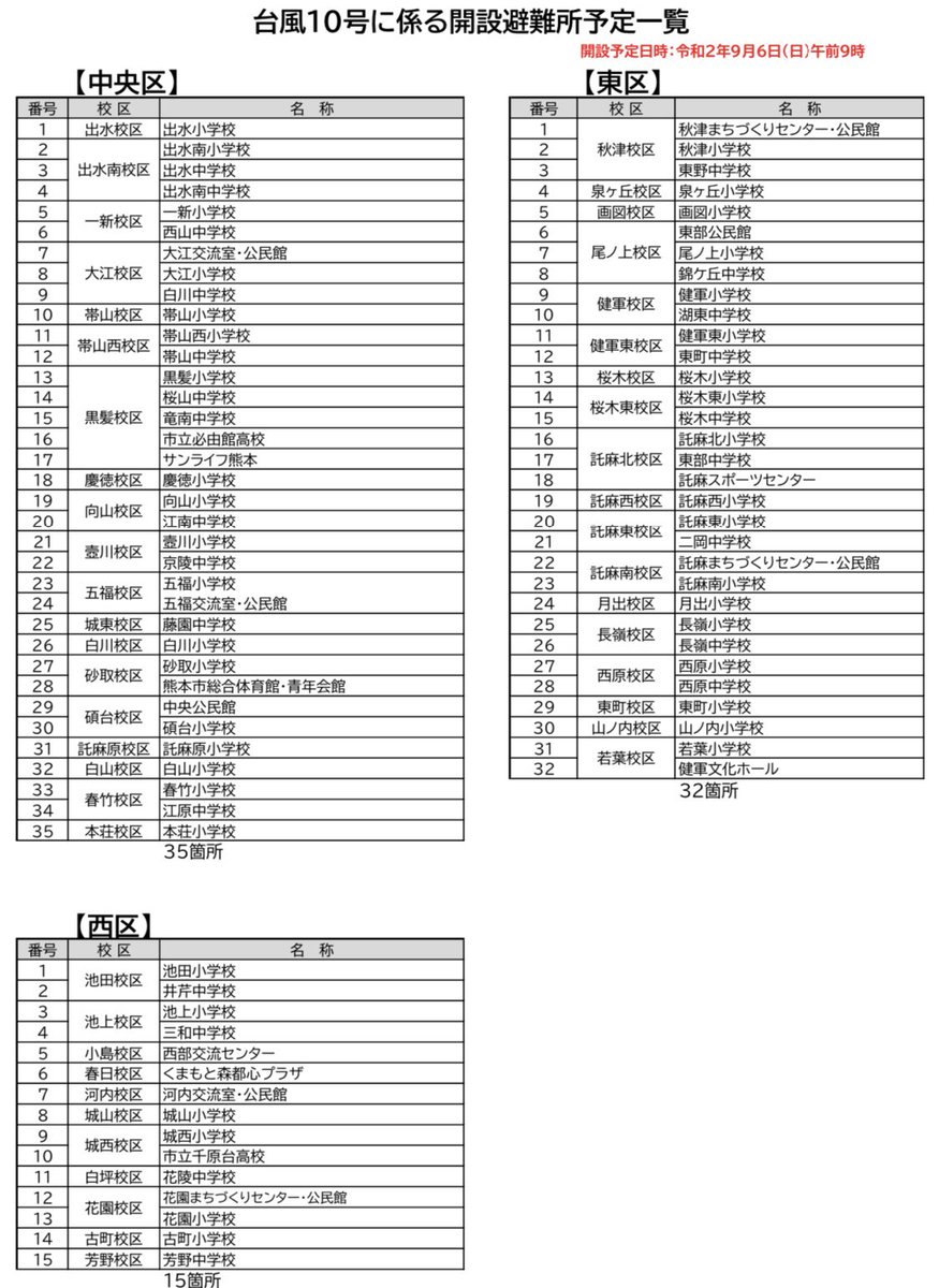 本日午前9時から熊本市内145カ所の避難所を開設します。避難所は感染症防止の対策を徹底しスペースを確保しておりますがマスクや体温計アルコール消毒液、食べ物飲み物等は各自で持参して下さい。避難所にペットは同行できませんのでペットホテル等をご利用下さい。city.kumamoto.jp/hpKiji/pub/det…