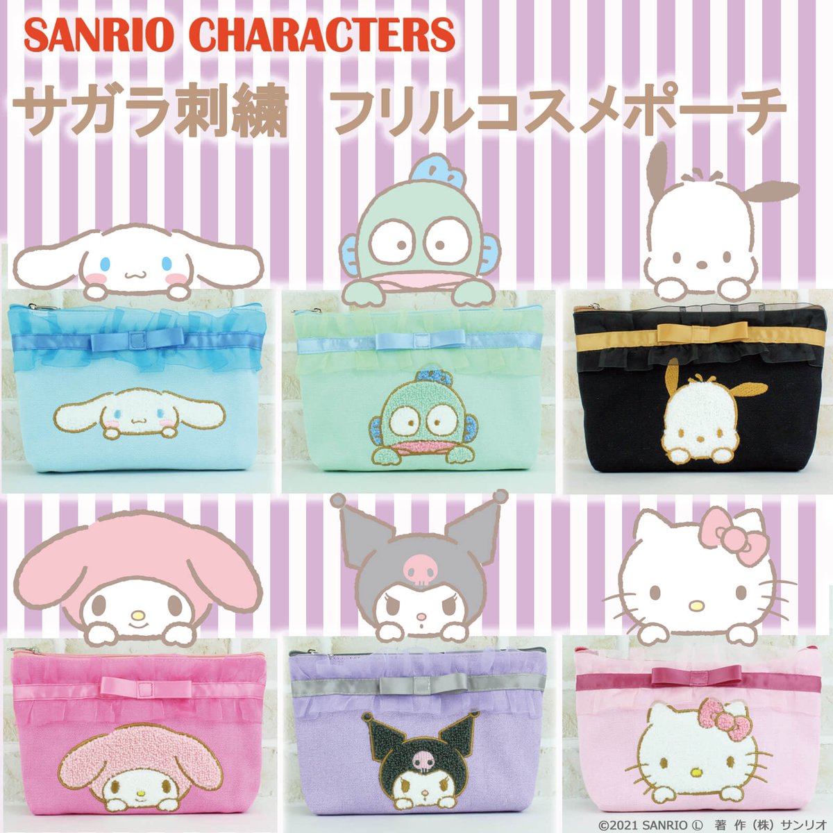 サンリオキャラクターズのサガラ刺繍フリルポーチが登場!ふかふかのキャラ刺繍&オーガンジーフリルがかわいい☆コスメポーチはもちろん文房具入れとしても◎MANUFATTO公式オンラインショップで♪ sanrio.eng.mg/17ce9