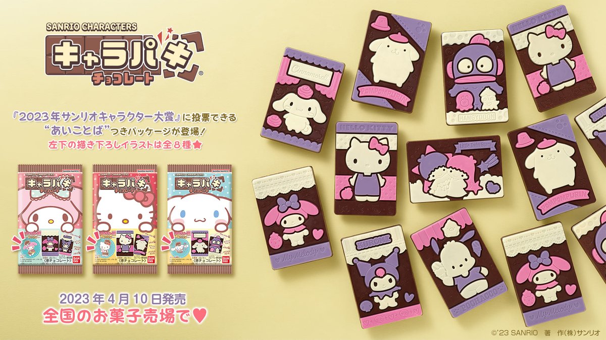 4色4味が楽しめるチョコレート「キャラパキ」に2023年サンリオキャラクター大賞へ追加投票ができる「あいことば」付きパッケージが期間限定で登場!チョコレートデザインは全8種。何が出るかは開けてからのお楽しみ♪全国のお菓子売り場などで♡ sanrio.eng.mg/c5613