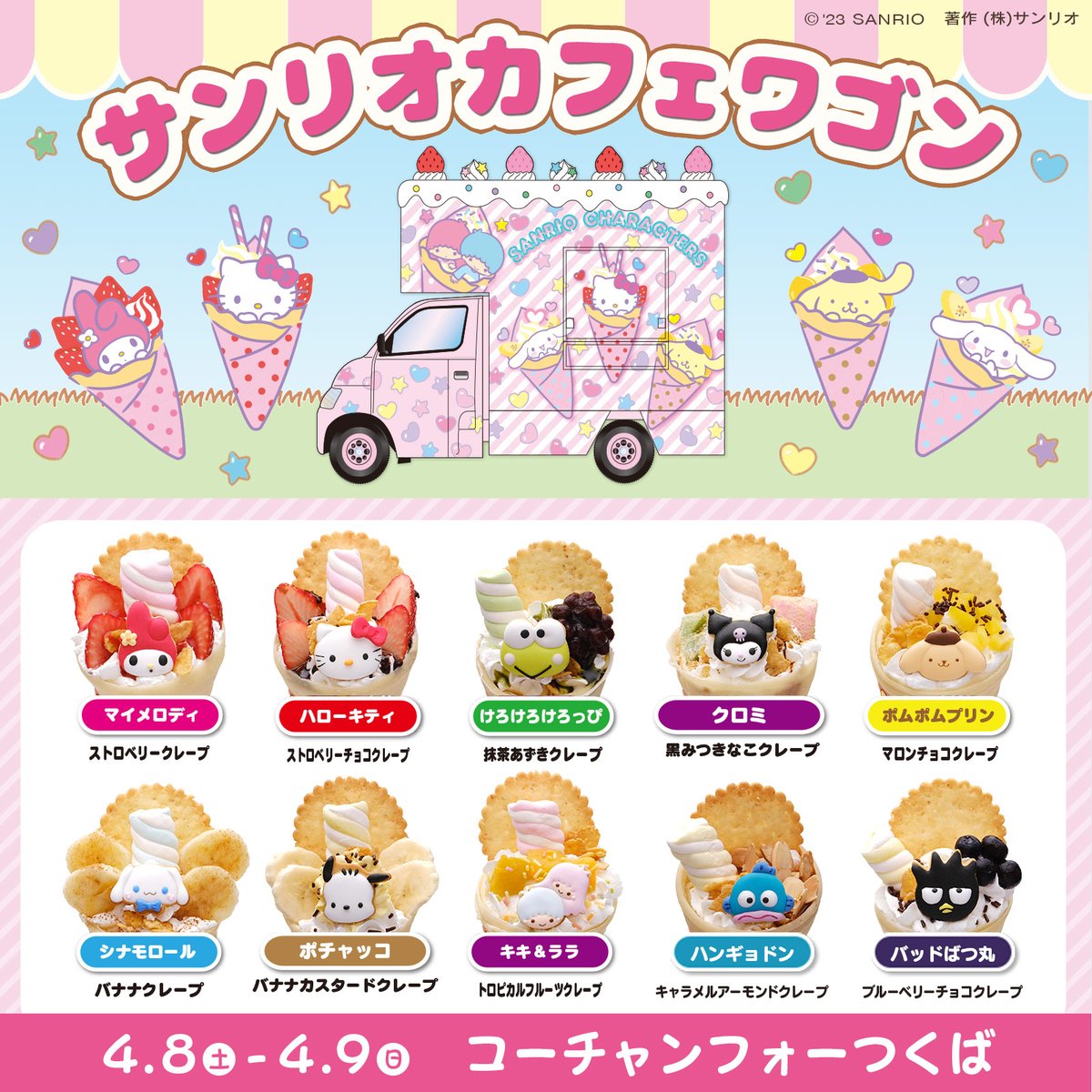 4/8(土)~4/9(日)コーチャンフォーつくば(茨城)にサンリオカフェワゴン「サンリオクレープ号」がやってくるよ♪インスタ映えバッチリのかわいいクレープやオリジナルグッズを販売!ぜひ遊びにきてね♡ sanrio.eng.mg/37596