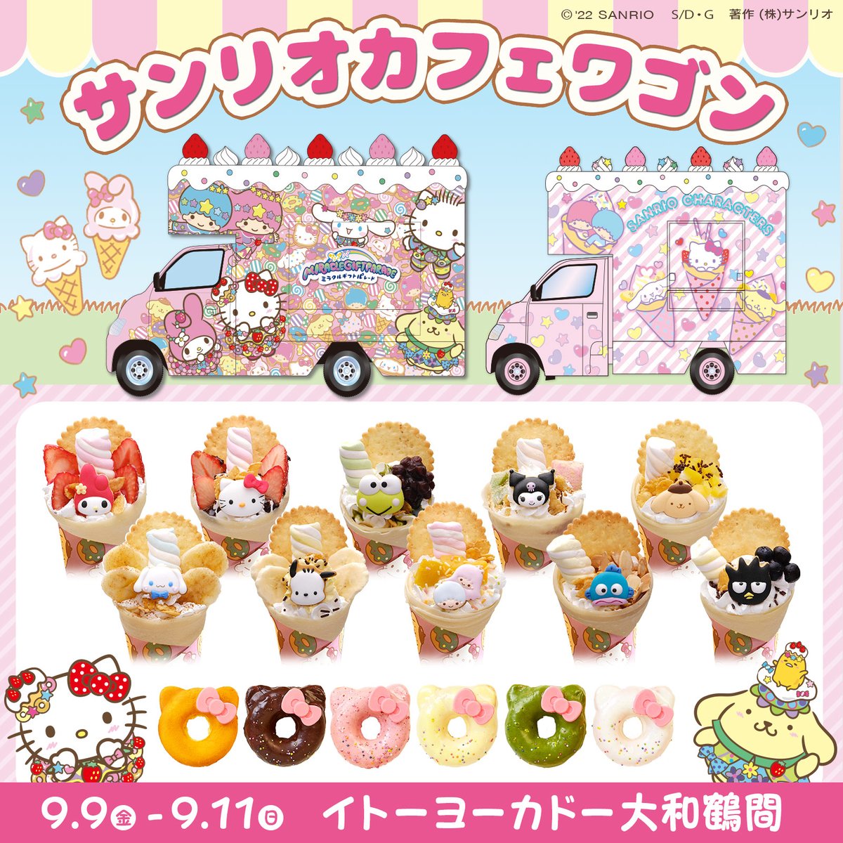 9/9(金)~9/11(日)イトーヨーカドー大和鶴間(神奈川)に「サンリオカフェワゴン」が登場!インスタ映えバッチリのキャラスイーツやオリジナルグッズを販売!税込み2,000円以上のお買い上げでノベルティプレゼントも♡ぜひ遊びに来てね! sanrio.eng.mg/b2f87