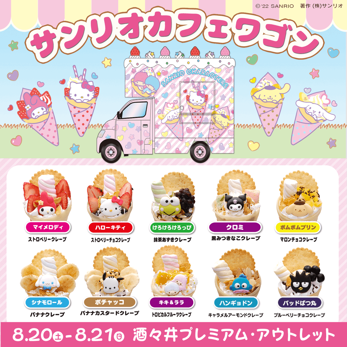 8/20(土)~8/21(日)酒々井プレミアム・アウトレット(千葉)に「サンリオカフェワゴン」が登場!種類豊富なキャラクターのクレープは選ぶのが楽しくなっちゃうかわいさ♪税込み2,000円以上のお買い上げでノベルティプレゼントも♡ sanrio.eng.mg/af846