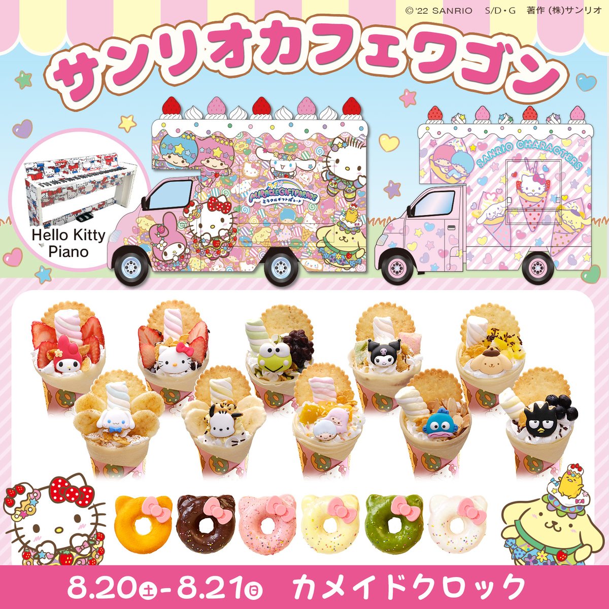 8/20(土)~8/21(日)カメイドクロック(東京)に「サンリオカフェワゴン」が登場!インスタ映えするかわいいクレープやオリジナルグッズを販売!「Hello Kitty Piano」も登場して、ピアニストによる演奏会も開催予定だよ♡ sanrio.eng.mg/cc584