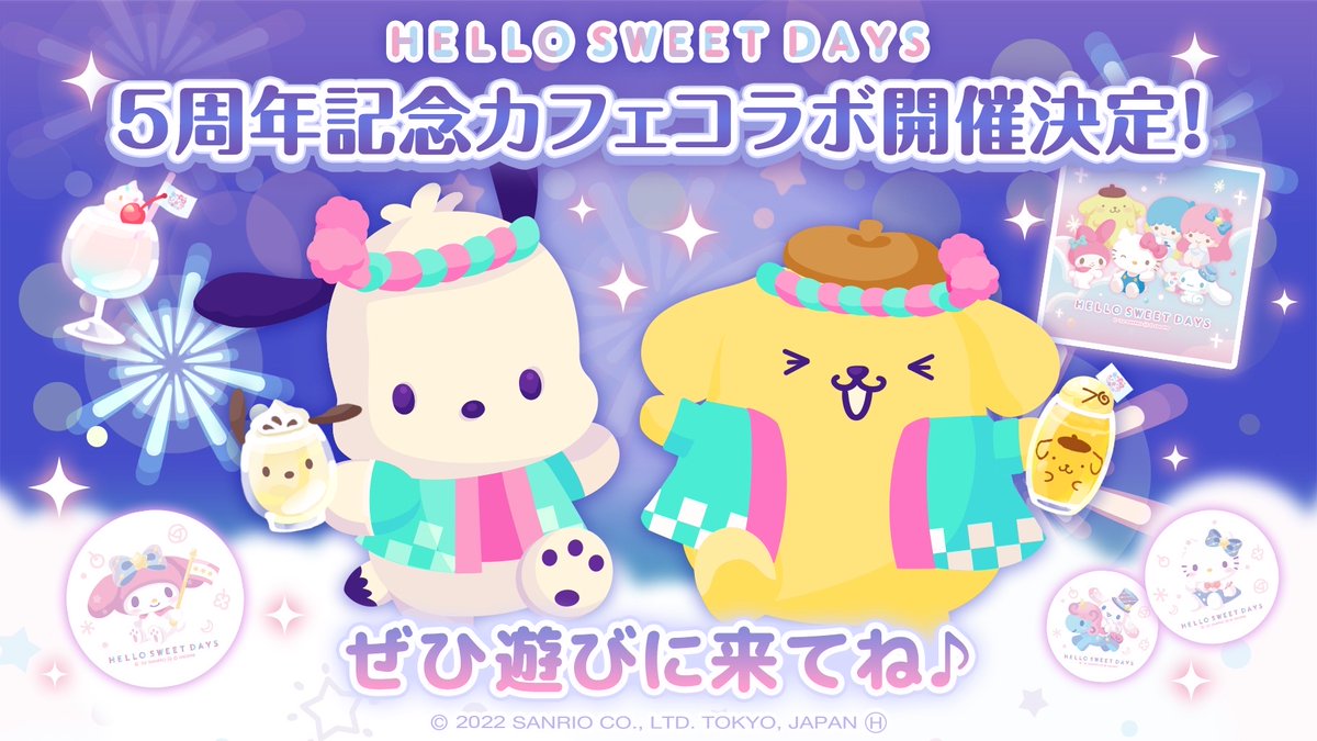 着せかえアバターアプリ「ハロースイートデイズ」は8/21(日)で5周年♪ポムポムプリンカフェ原宿店・シナモロールカフェ新宿店・サンリオキャラクターズ ハニトーカフェにコラボメニューが登場!8/20(土)から8/31(水)までの期間限定だよ☆ sanrio.eng.mg/555ef