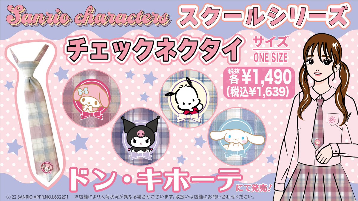 「サンリオキャラクターズ スクールシリーズ」に新作が登場!キャラに合わせたチェックの色がCUTEなチェックネクタイと、キャラのワンポイント付きハイソックスだよ♡ドン・キホーテ限定で販売中♪ sanrio.eng.mg/27206