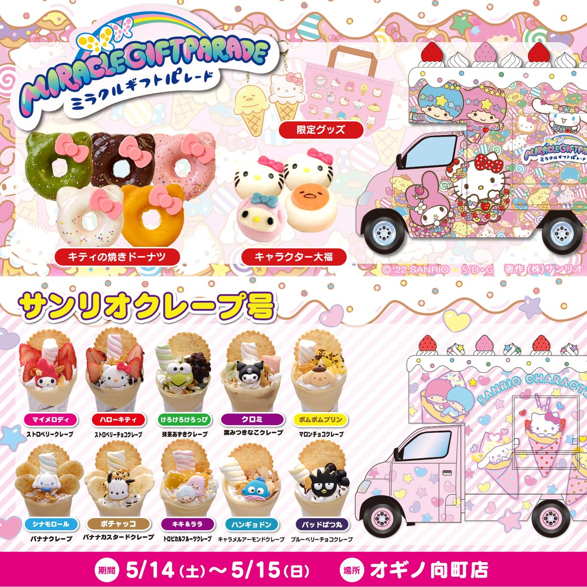 5/14(土)~5/15(日)オギノ向町店(山梨)に「サンリオカフェワゴン」が登場!「ミラクルギフトパレード号」「サンリオクレープ号」がやってくるよ♪インスタ映えするキャラスイーツやオリジナルグッズを販売!ぜひ遊びに来てね♡ sanrio.eng.mg/7a370