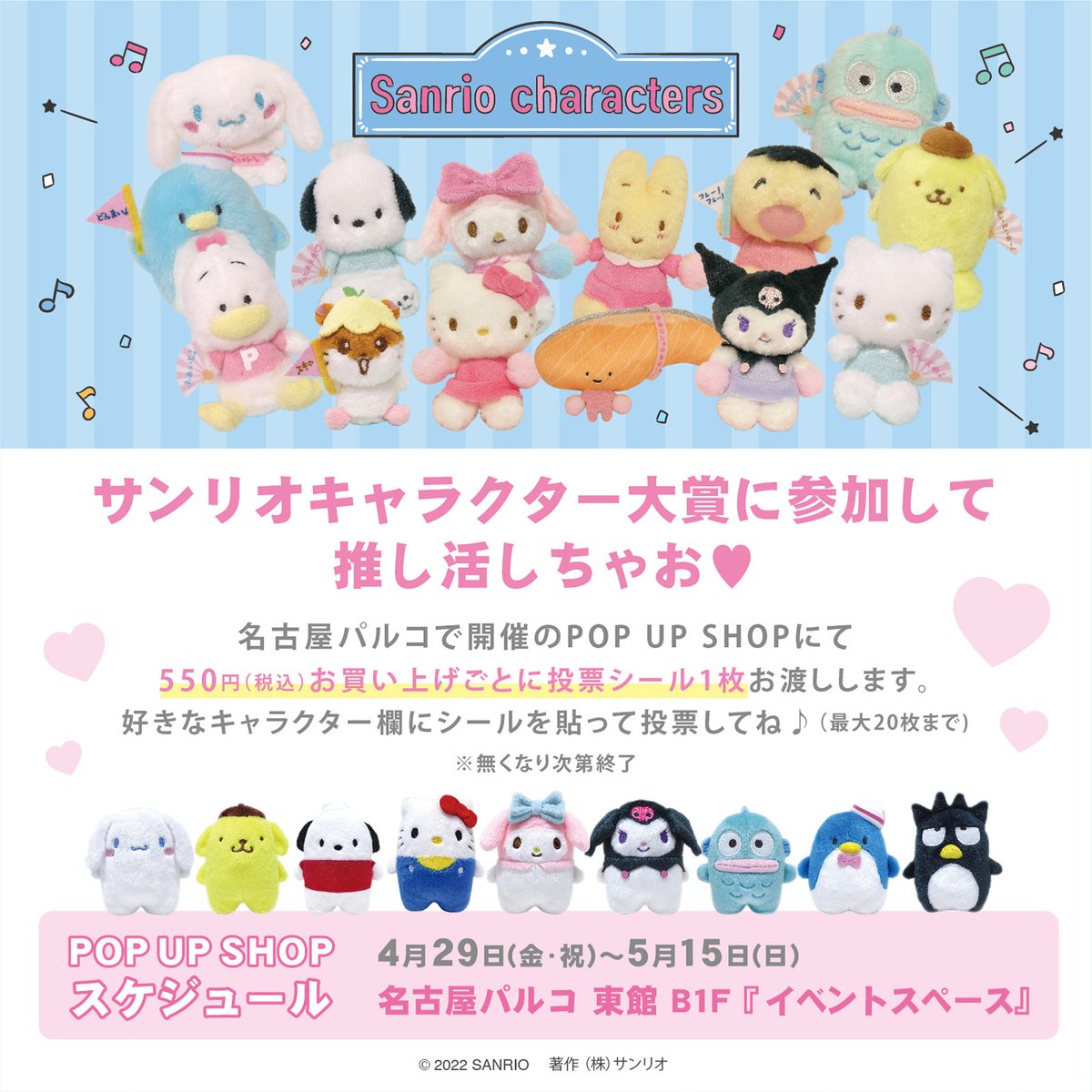 4/29(金・祝)~5/15(日)名古屋パルコに「Sanrio characters POP UP SHOP」が期間限定OPEN!かわいいグッズが目白押し♪サンリオキャラクター大賞にも税込み550円の購入につき1票を、その場で投票できちゃうよ♡ノベルティも要CHECK! sanrio.eng.mg/5d88a