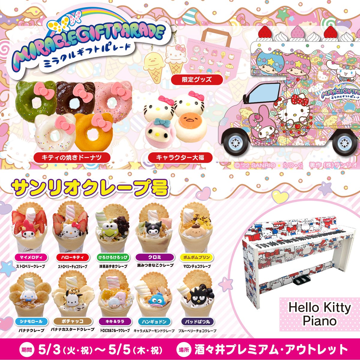 5/3(火・祝)~5/5(木・祝)酒々井プレミアム・アウトレット(千葉)に「サンリオカフェワゴン」が登場!インスタ映えするかわいいクレープやオリジナルグッズを販売!「Hello Kitty Piano」も登場して、ピアニストによる演奏会も開催予定だよ♡ sanrio.eng.mg/d7f7e