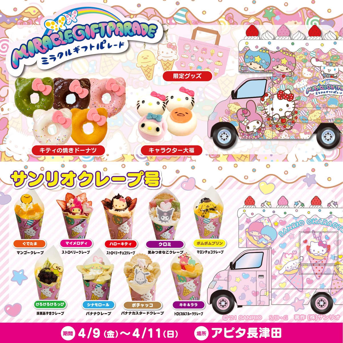 4/9(金)~4/11(日)アピタ長津田(神奈川県)にサンリオカフェワゴンが登場!インスタ映えするキャラクタースイーツやオリジナルグッズを販売!お買い上げでかわいいノベルティもプレゼント! sanrio.eng.mg/0855a