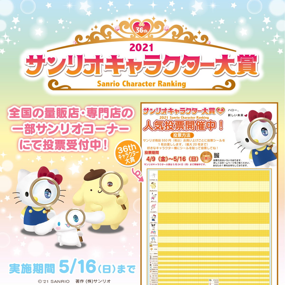 全国の量販店・専門店の一部サンリオコーナーでもサンリオキャラクター大賞の投票がスタート!お買い上げ税込み550円ごとにもらえる投票シールをお店に設置のボードに貼ってね♪5/16(日)まで☆ sanrio.eng.mg/162f1