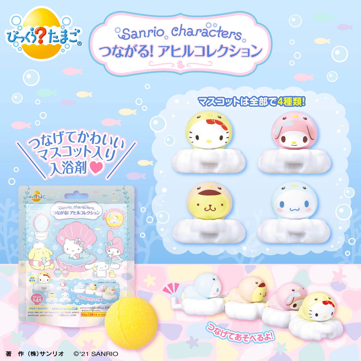 入浴剤「びっくら?たまご」にサンリオキャラクターズが泡に乗ったアヒルスタイルで登場!全4種類のマスコット同士はフックでつなげることができるよ♡全国の量販店、ドラッグストアなどで発売中★ sanrio.eng.mg/963fc