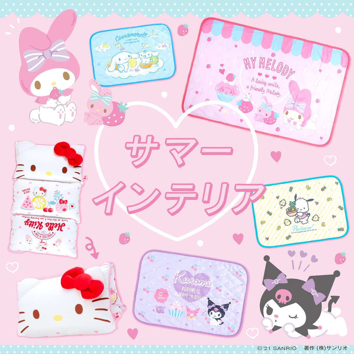 【サマーインテリア】暑い夏に、キャラクターたちとおうちで快適に過ごすためのインテリアアイテムはいかが?さらっとした手触りのブランケット・枕カバー・クッションだよ☆サンリオショップでね♡ sanrio.eng.mg/3d5fe
