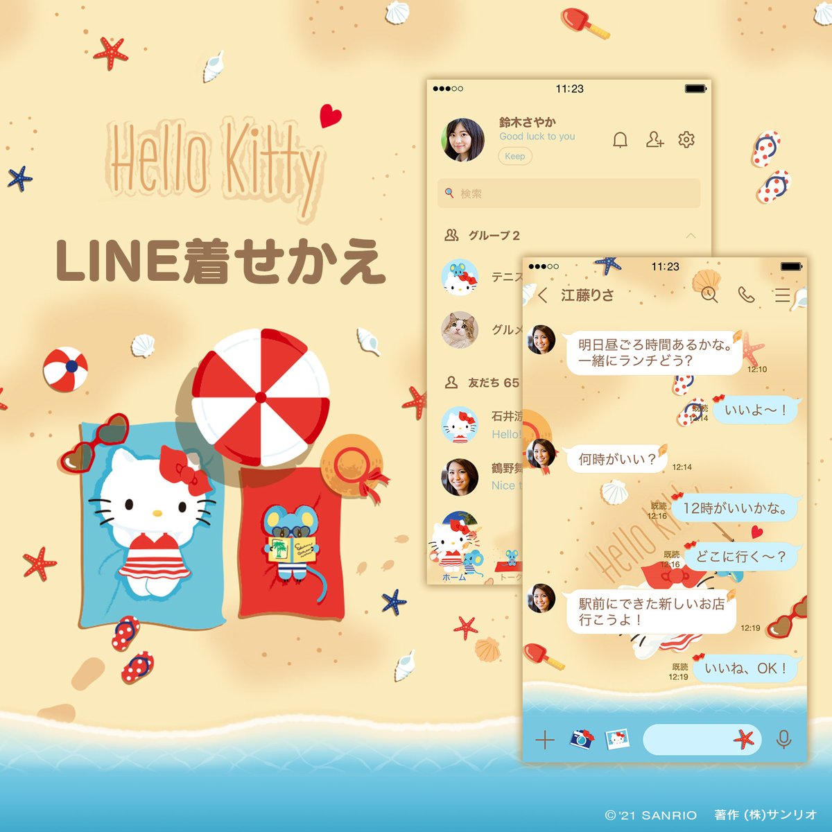 【LINE着せかえ ハローキティ ビーチでバカンス♪】広いビーチでゆっくりリラックスするふたりがキュート♡夏らしい爽やかな着せかえが登場だよ! DLはコチラ→sanrio.eng.mg/27efd