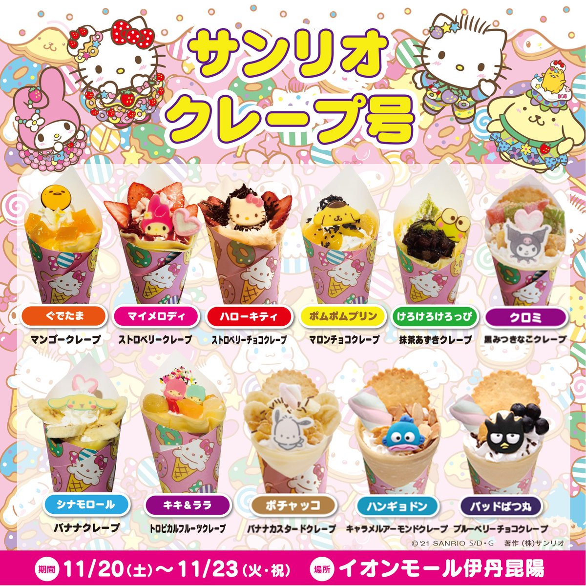 11/20(土)~11/23(火・祝)イオンモール伊丹昆陽(兵庫)に「サンリオ カフェワゴン」が登場!インスタ映えするかわいいキャラスイーツやオリジナルグッズを販売!お買い上げでノベルティプレゼントも! sanrio.eng.mg/5cb8e