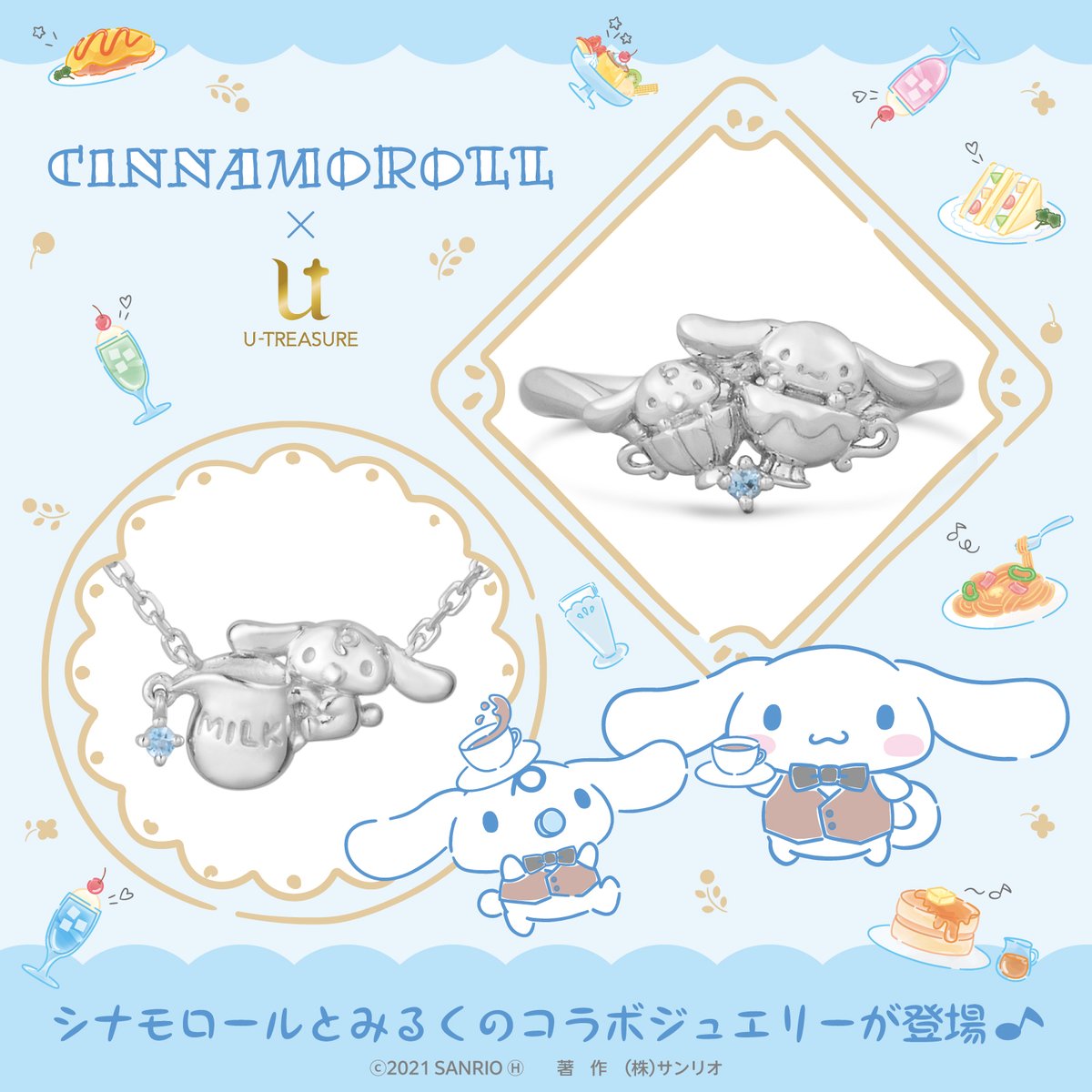 ユートレジャーからシナモロールとみるくのコラボジュエリーが登場!アクアマリンがアクセント☆ミルクピッチャーを持った甘えん坊のみるくやティーカップになかよく乗ったふたりの姿がかわいいね♡ sanrio.eng.mg/98ec6