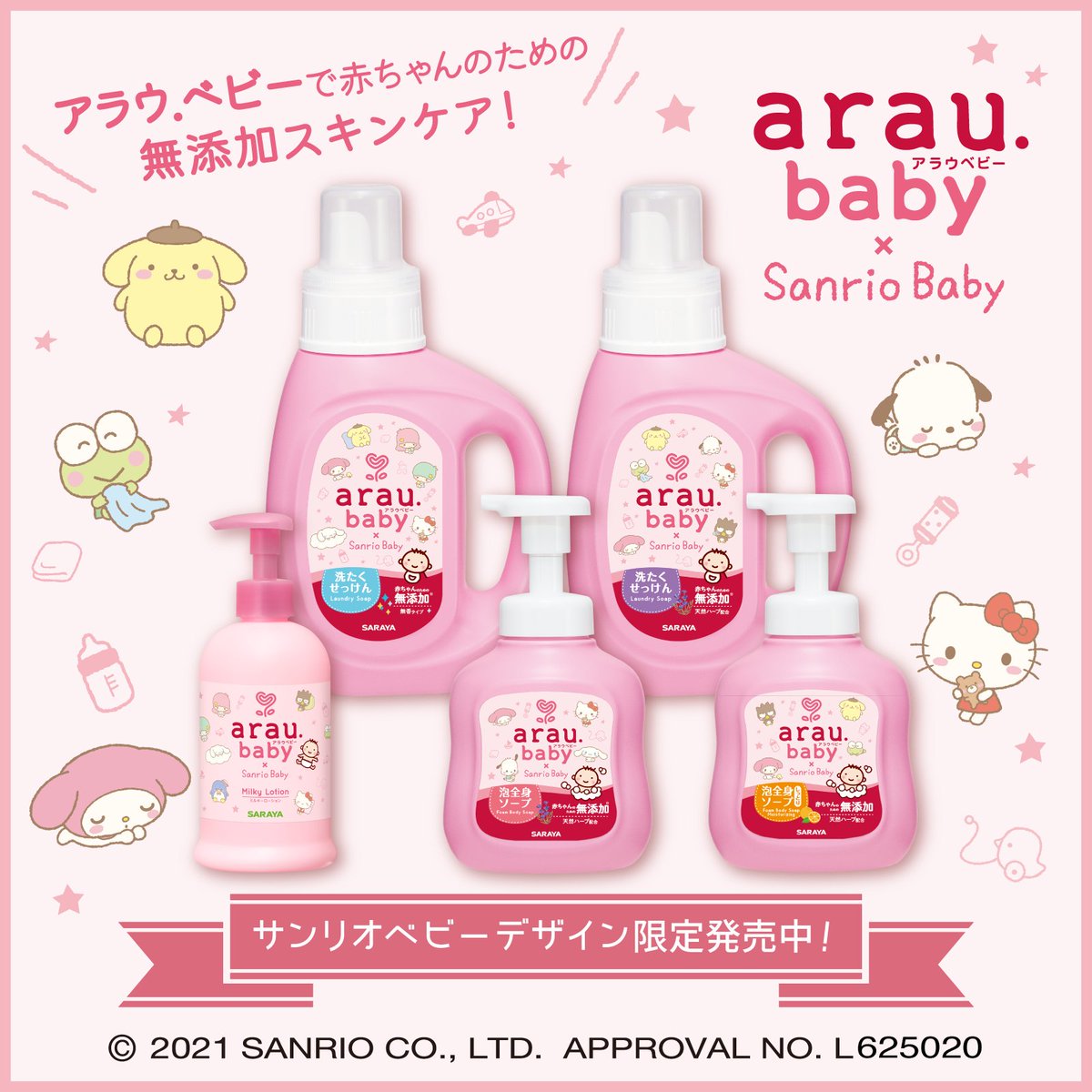 赤ちゃんのための無添加せっけん+天然ハーブの「アラウ.ベビー」からSanrio Babyデザインが期間限定で登場!ピンクボトルに描かれたかわいいデザインが、ママや家族にハッピーな気持ちをお届け♡ sanrio.eng.mg/d4f1b