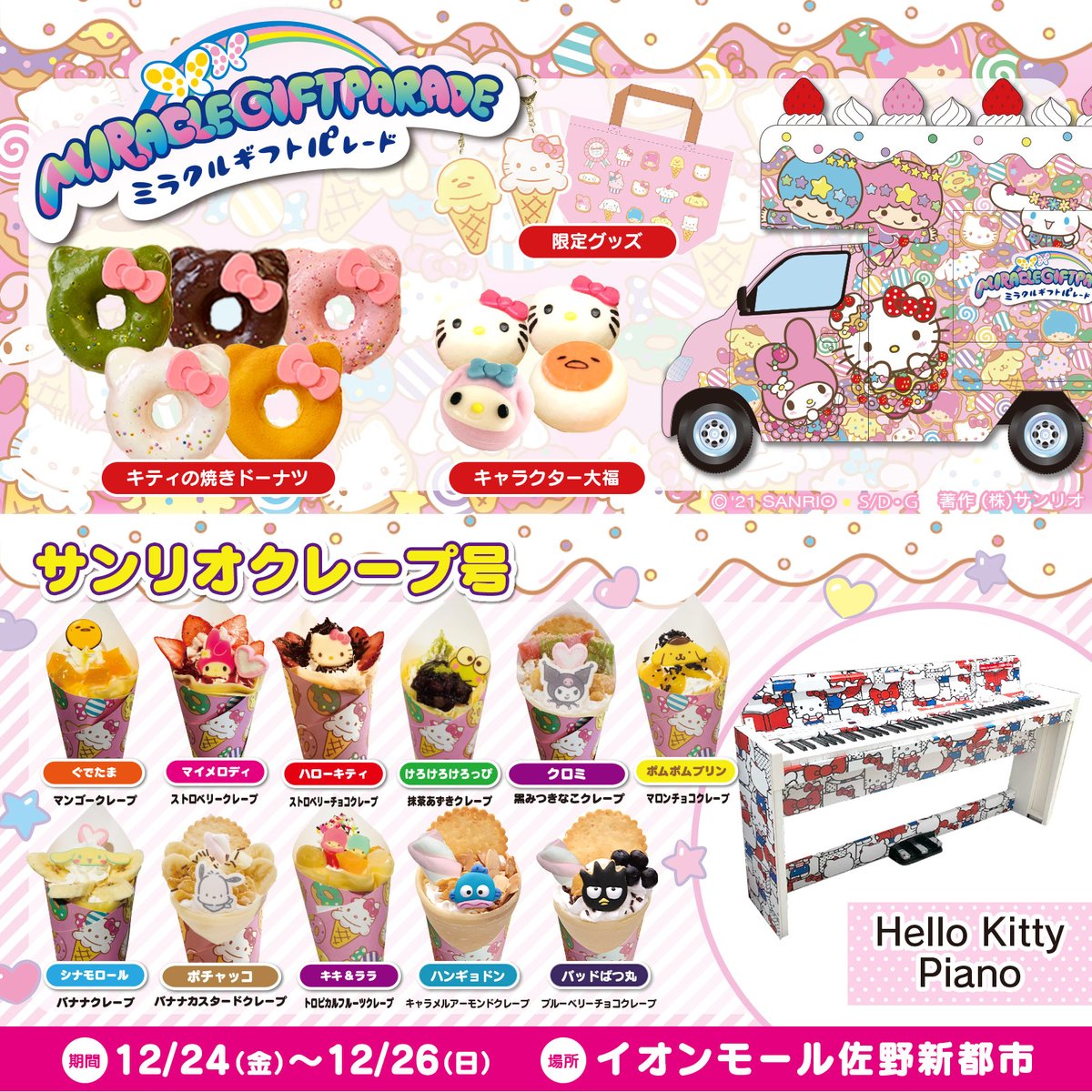12/24(金)~12/26(日)イオンモール佐野新都市(栃木)にサンリオカフェワゴンが登場!インスタ映えするかわいいキャラスイーツやオリジナルグッズを販売!お買い上げでノベルティプレゼントも! sanrio.eng.mg/3e2ee