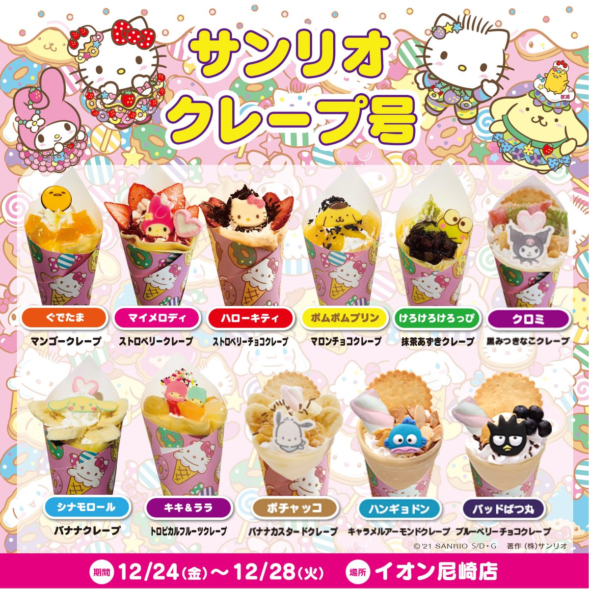 12/24(金)~12/28(火)イオン尼崎店(兵庫)に「サンリオ カフェワゴン」が登場!インスタ映えするかわいいキャラスイーツやオリジナルグッズを販売!お買い上げでノベルティプレゼントもあるよ!