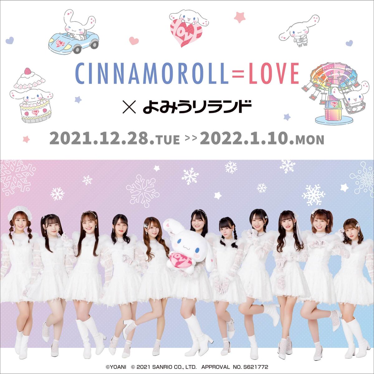 12/28(火)~来年1/10(月・祝)の会期でシナモロールと「=LOVE(イコールラブ)」が、よみうりランド(東京都)とのコラボイベントを開催!グッズ&フード販売やアトラクション、スタンプラリーなどコラボ企画がいっぱい♪限定販売の特別ワンデーパスもチェック★ sanrio.eng.mg/bab64