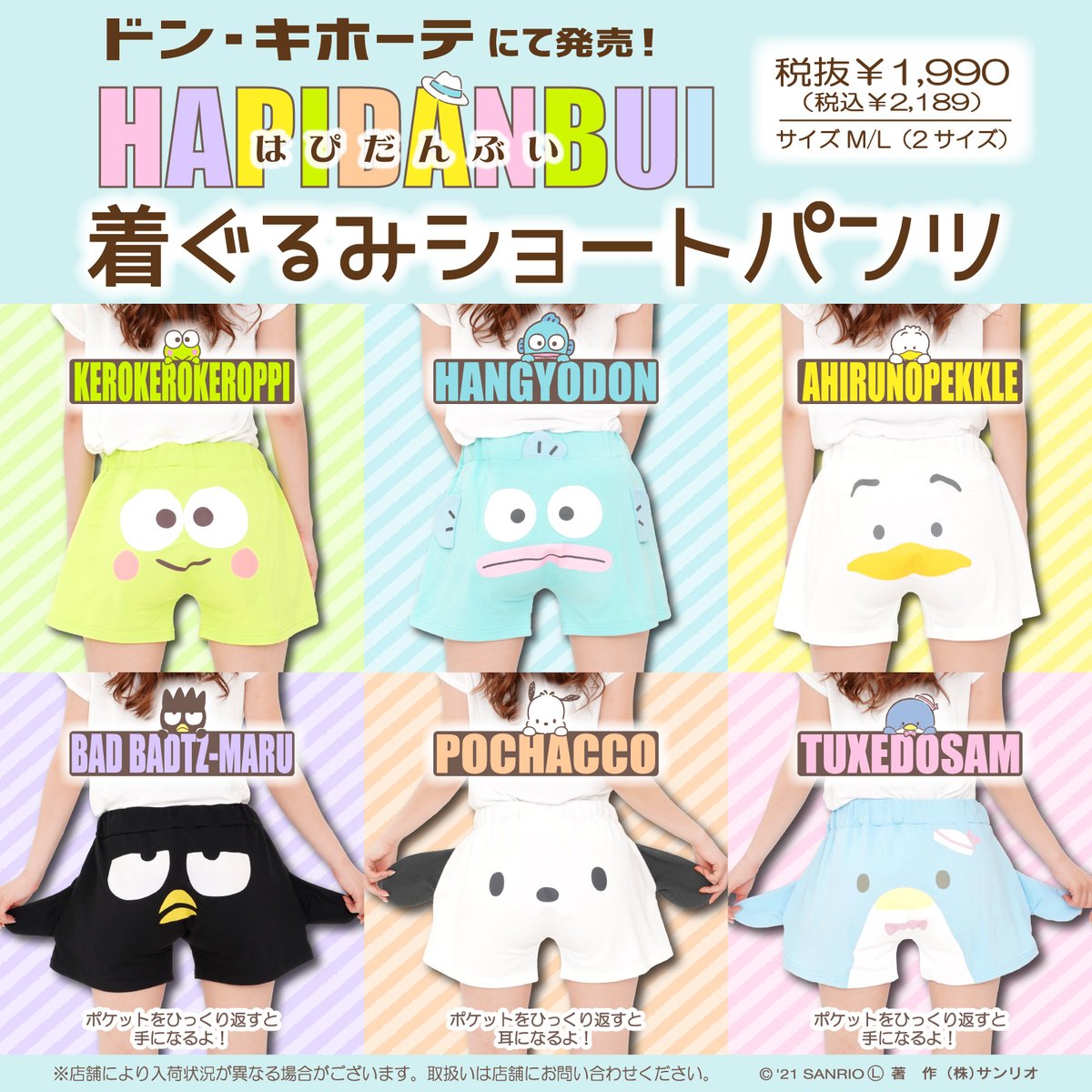 ドン・キホーテからはぴだんぶいの着ぐるみショートパンツが登場!バッドばつ丸・ポチャッコ・タキシードサムはポケットをひっくり返すと手や耳になってCUTE♡ ※店舗により入荷状況が異なります。 sanrio.eng.mg/01be2