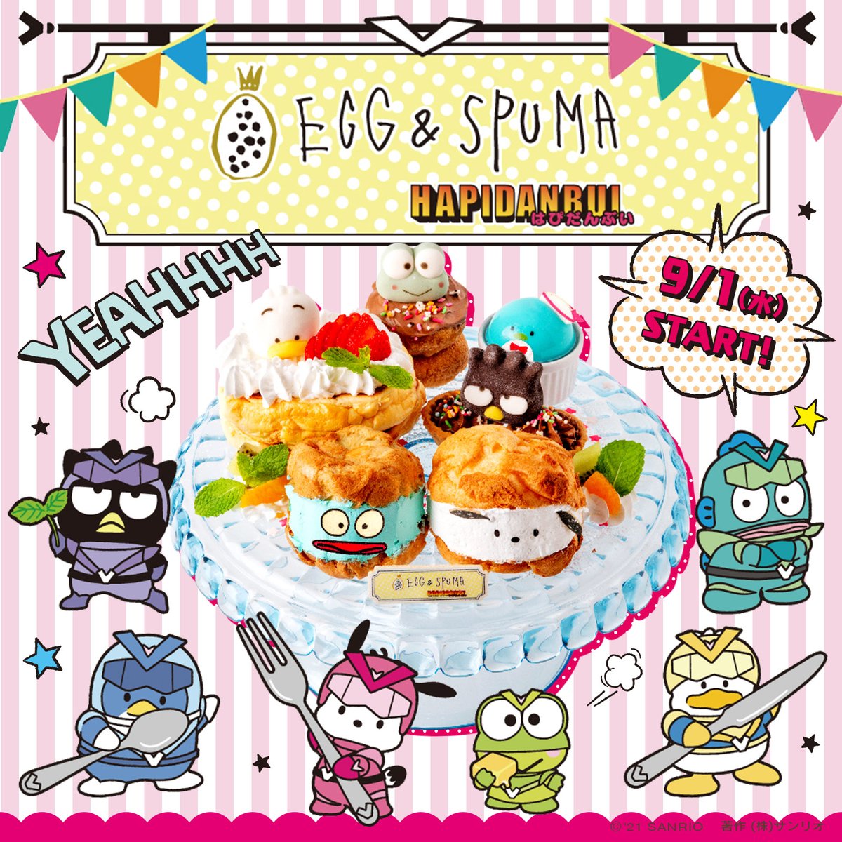 9/1(水)~10/31(日)までの期間限定!新宿ルミネエスト8F「EGG&SPUMA」に、はぴだんぶいカフェがOPEN♪ハッピー戦隊★はぴだんぶいのカッコいいコラボメニューが大集合!ノベルティもGETしよう♪ sanrio.eng.mg/86b8f