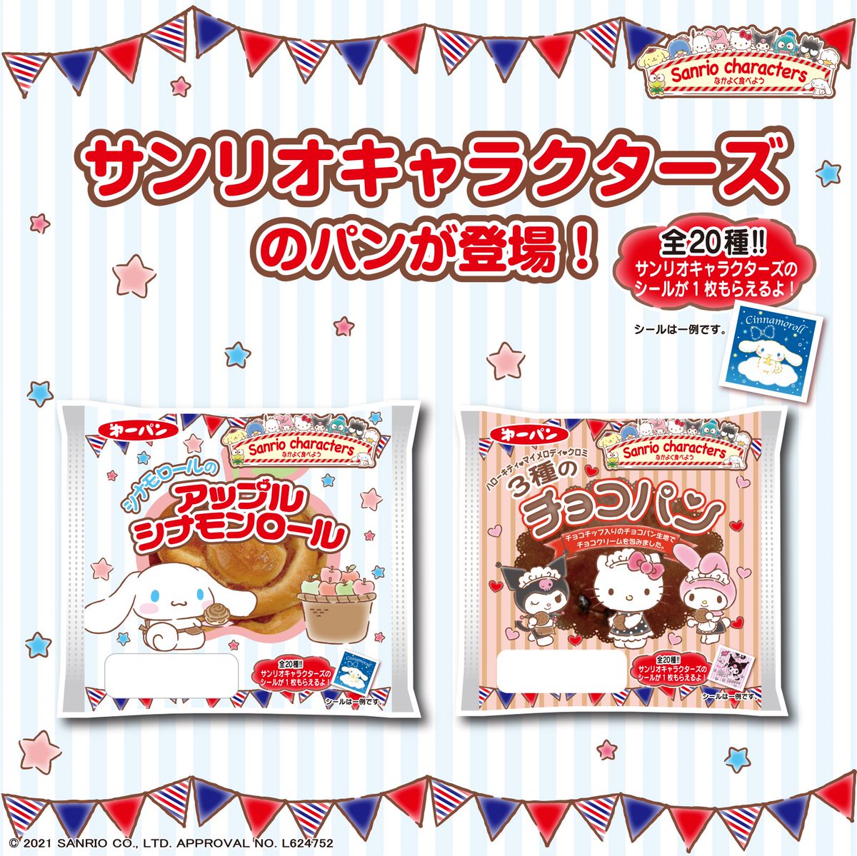 第一屋製パンからシナモロールの「アップルシナモンロール」とハローキティ・マイメロディ・クロミの「3種のチョコパン」が登場!オリジナルシール1枚入り☆デザインは全20種あるのでぜひ集めてね♪ sanrio.eng.mg/f0f3f