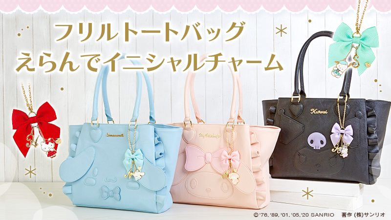 【フリルトートバッグ・えらんでイニシャルチャーム】フェミニンなファッションが好きな女のコに向けたフリル付きのトートバッグと、えらんで作るオリジナルチャームが登場!サンリオショップでね♡ sanrio.eng.mg/d31fe