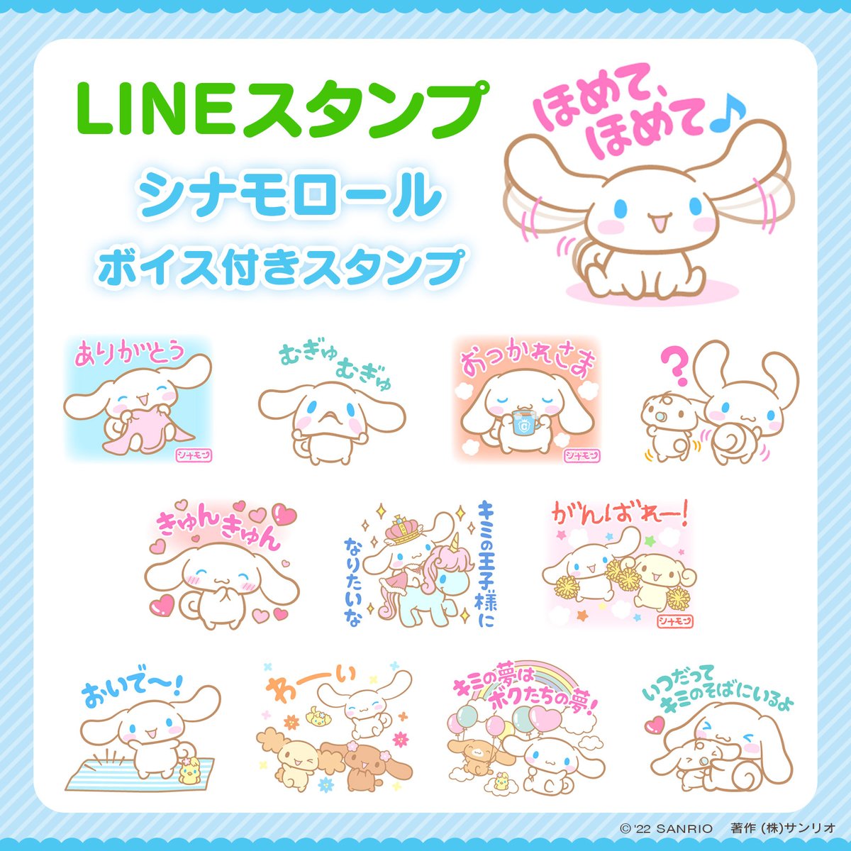 【LINEスタンプ シナモロール ボイス付きスタンプ】デビュー20周年を迎えたシナモロールの特別なボイス付きスタンプが登場♪3つのスタンプはシナモンが文字を書くのをお手伝いしてくれたよ☆サインが目印♪ sanrio.eng.mg/e403f