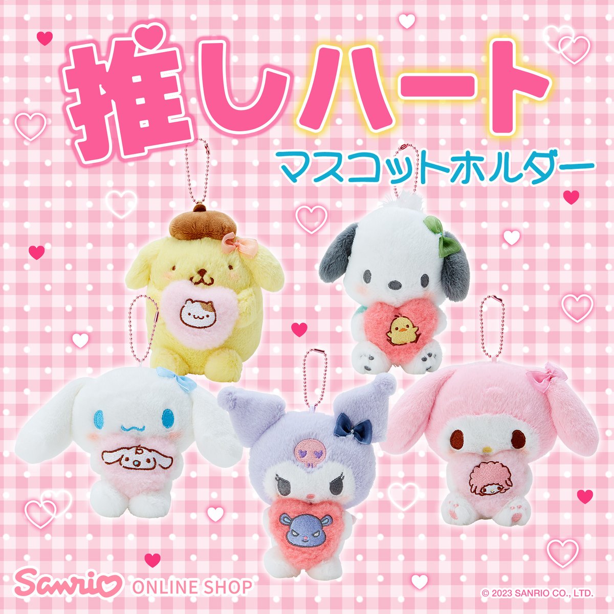 【サンリオオンラインショップ】なかよしのお友だちの顔が入ったハートをギュッと抱いたキャラクターたちのマスコットホルダー♡みんなの左耳にちょこんとついたリボンがかわいいでしょ♪ sanrio.eng.mg/eae88 #sanrioec