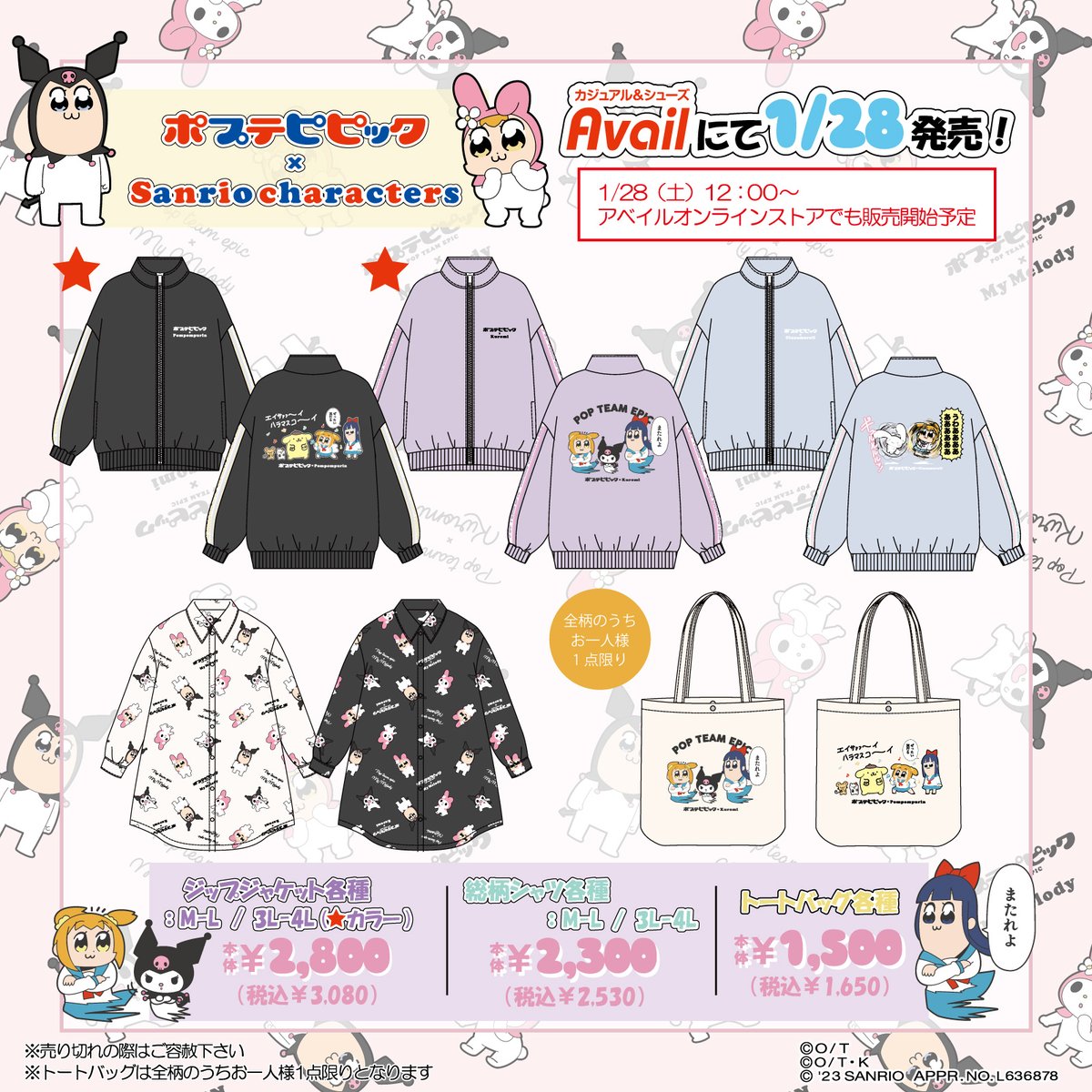 禁断のコラボ、またまた登場っ★ポプテピピックとサンリオキャラクターズのコラボアイテムが1/28(土)~全国の #アベイル で発売!ぜひチェックしてみてね♡ #avail 店舗→ sanrio.eng.mg/d6287 オンラインも同日12:00~販売→ sanrio.eng.mg/7a284