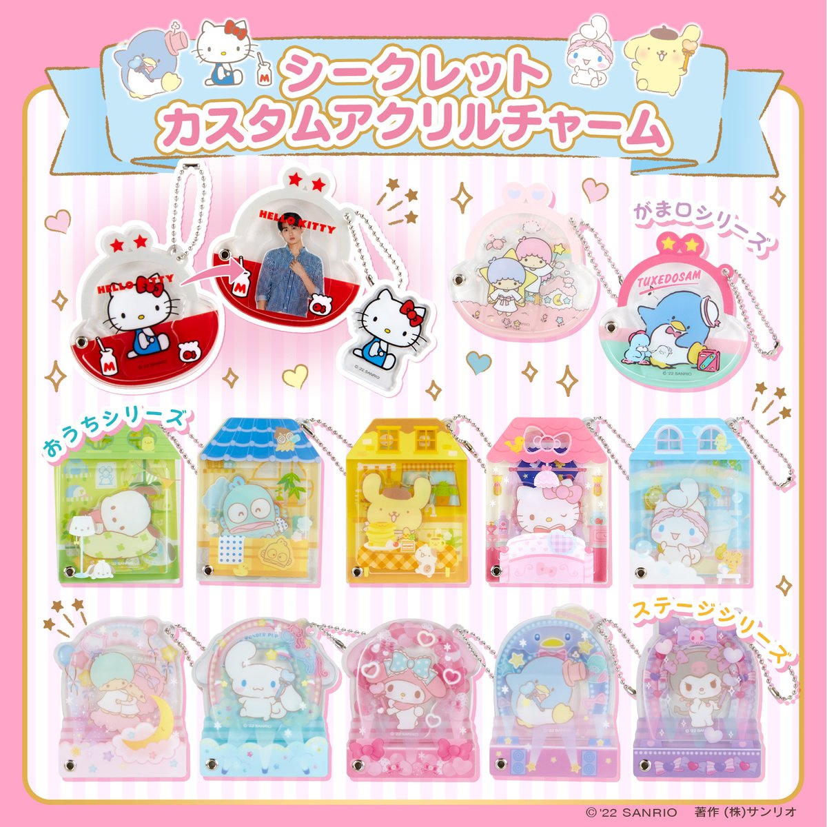 【シークレットカスタムアクリルチャーム】スライド開閉できるから、中に入れるチャームや切り抜きなどを自由に入れ替えてカスタマイズ!第3弾では、おうち・がまぐち・ステージの3デザインをご用意☆ sanrio.eng.mg/23032 ECサイト sanrio.eng.mg/7a983