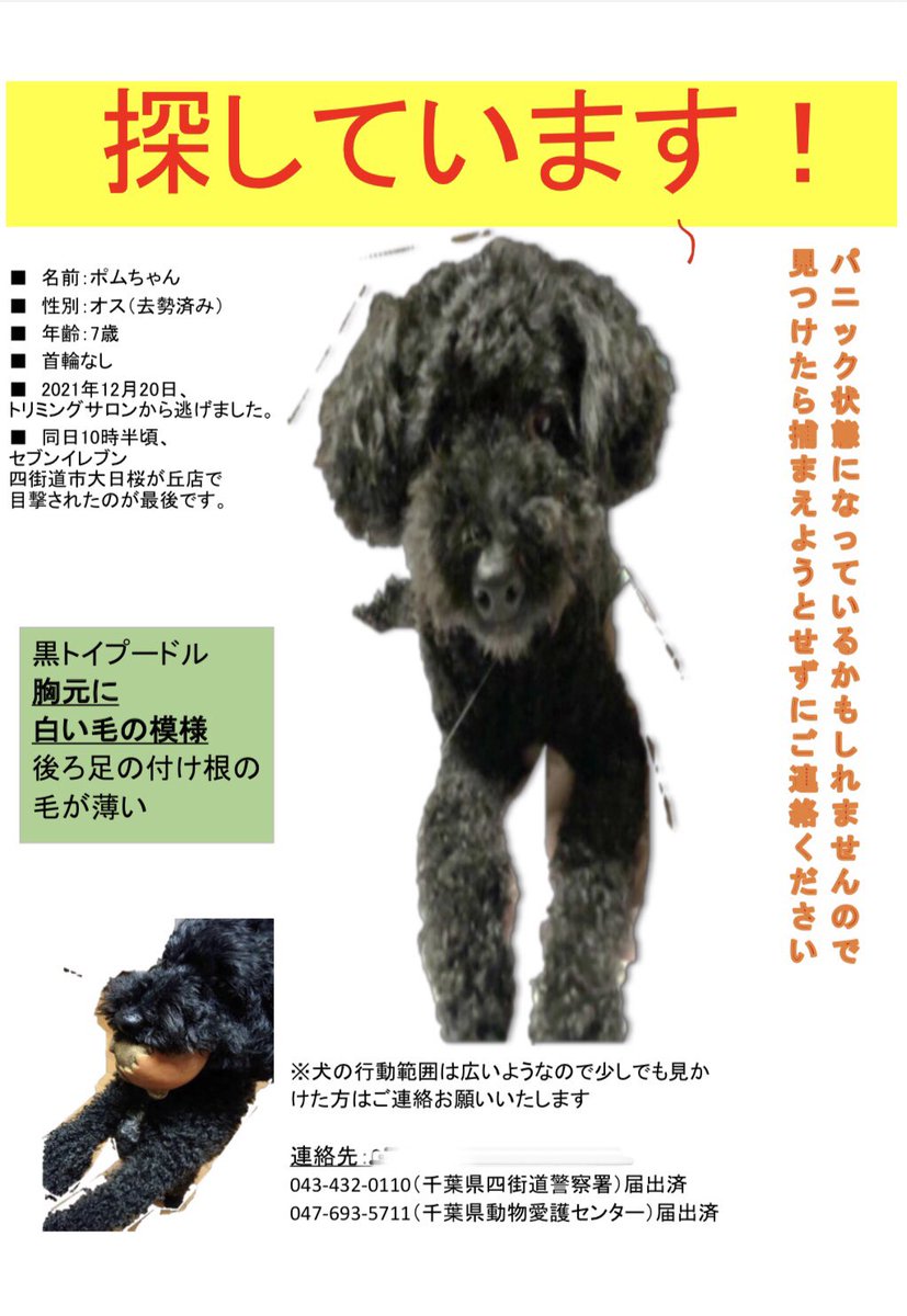 【拡散希望】【(再)情報求む❗️】2021年12月20日お昼頃、黒いトイプードルが迷子になりました。標準よりも大きめで、胸に白い毛の模様があります。気が小さく、外では大人しい子のようです。場所は、四街道の大日町桜ヶ丘辺り、そこから市をまたいで遠くに行った可能性もあります。