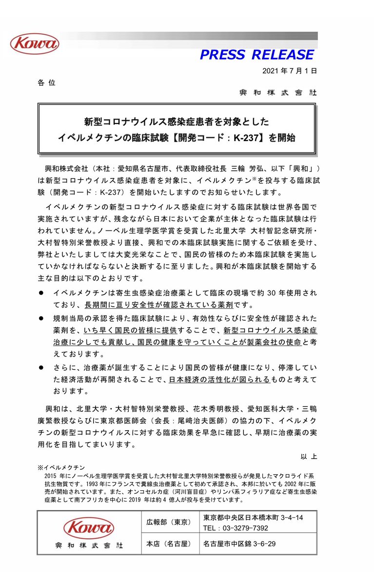大村智博士、花木秀明先生、興和さんとも連携し、国民の命、健康を守る選択肢を広げるため引き続き、精一杯努力致します。