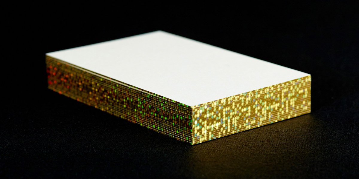 ホログラム箔に新柄「レインボーブルー」登場です。様々な表情を見せる大変面白い箔になります。ホログラム箔押しフェア対象ですので、50%割引でご利用いただけます。