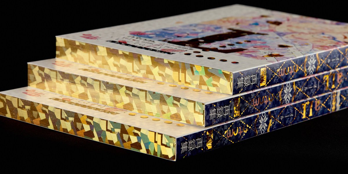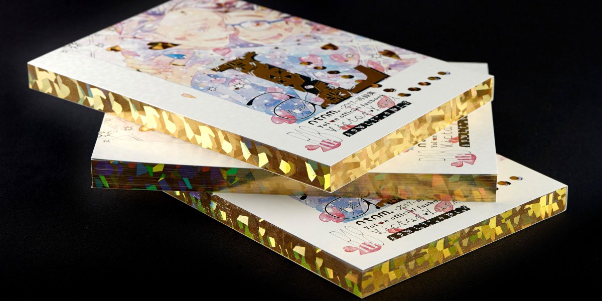 天金加工のページににサークル、ntnm./夏生(@ntooooo_YOI)様の御著書「aLL」の写真を掲載させて頂きました。表紙や背の箔押しと相まって、きらきら仕様になっています。天金の箔と表紙の箔を同じ箔にすると統一感がでて、大変素敵な仕上がりになります。 bit.ly/2QUpOQI