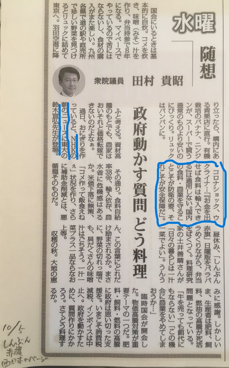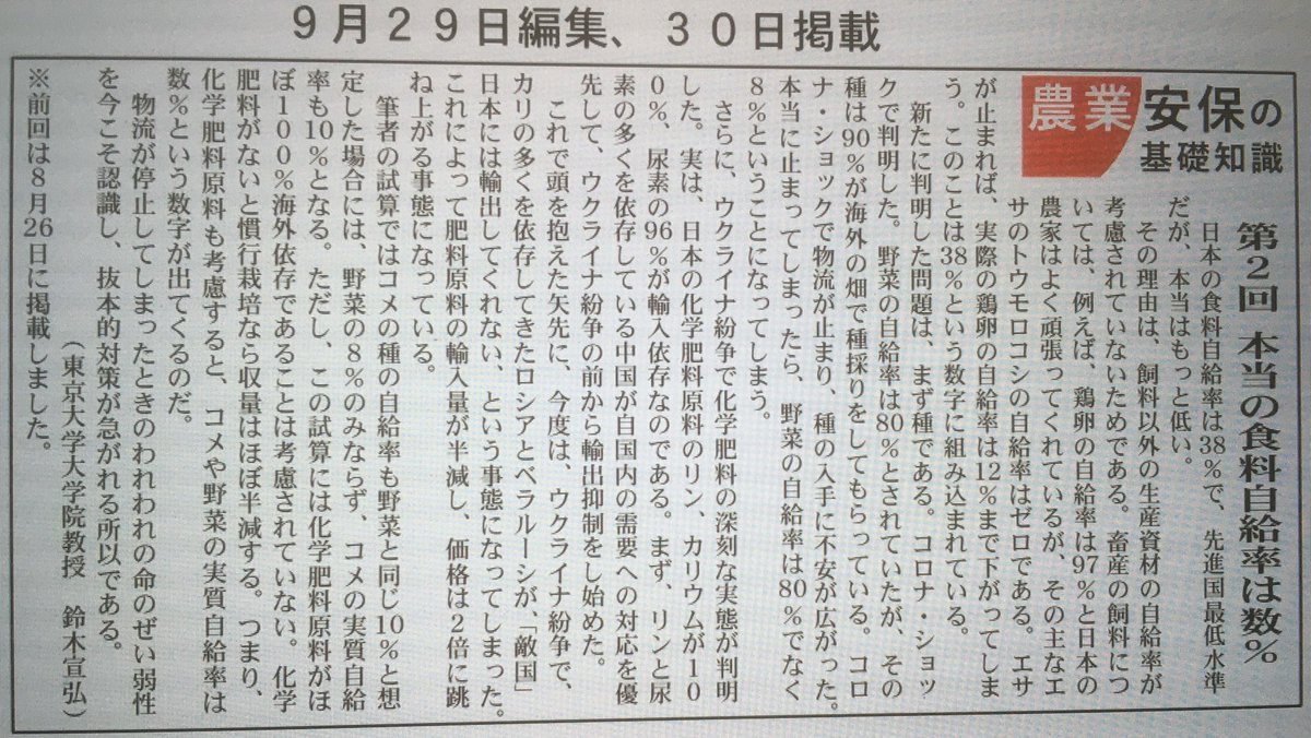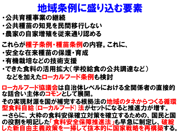 世界一飢餓に脆弱な国である現実を直視し、超党派の議員立法として提案見込みの「地域のタネからつくる循環型食料自給(ローカルフード)法」に加えて、国民と政府の役割を明記した「食料安全保障推進法」を早急に制定し、発動基準を明確にした数兆円規模の予算措置を急げ。