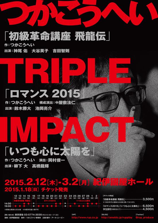 「つかこうへいTRIPLE IMPACT」出演者情報を更新いたしました。2015年2/12〜3/2紀伊國屋ホール「初級革命講座飛龍伝」「ロマンス2015」「いつも心に太陽を」